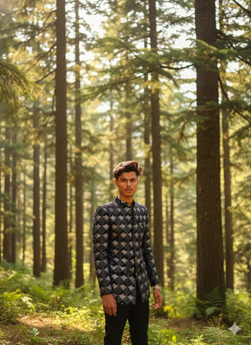 Young man standing in lush green Pahalgam forest, tall deodar trees, soft sunlight breaking through branches, gentle mountain wind effect on hair, natural warm tones, crisp outdoor portrait, magazine-style Kashmir aesthetic.