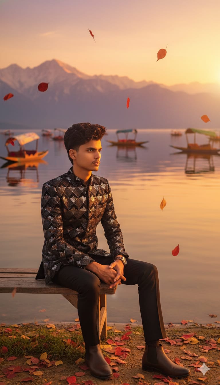 “Young man sitting near Dal Lake during golden hour, reflection of mountains in water, traditional shikara boats behind him, warm sunset glow on face, chinar leaves falling, calm cinematic mood, hyper-realistic portrait, 8K detail.”