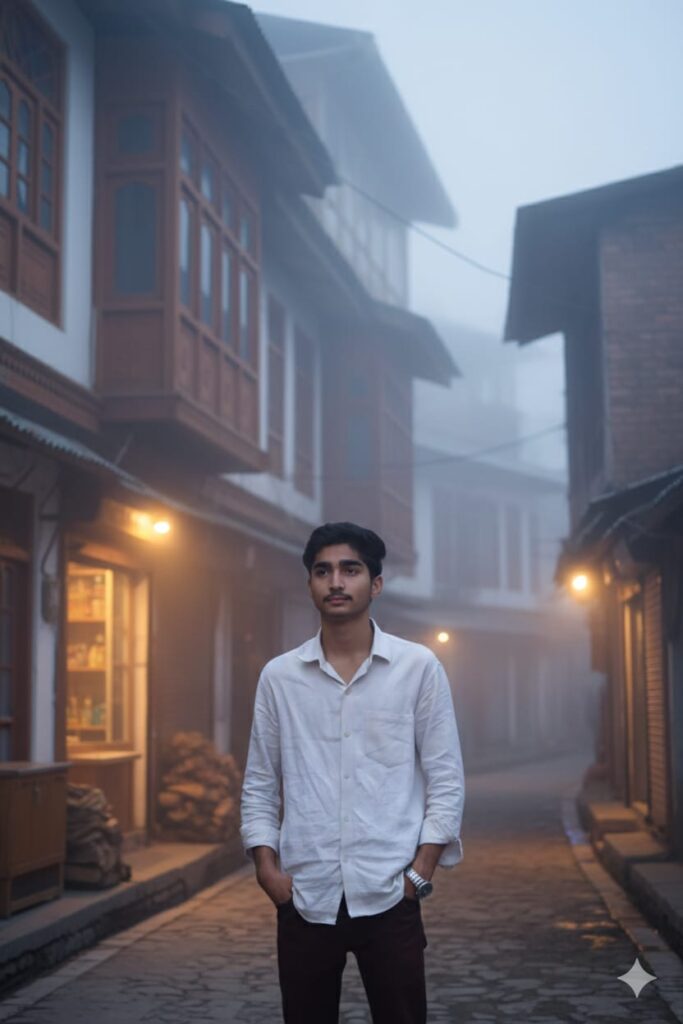 Portrait of a young man in a classic Kashmiri street of Srinagar, wooden houses with carved windows, soft winter fog, ambient warm lighting from shop lamps, natural expression, deep tones, editorial Kashmiri street photography style, ultra-realistic.”