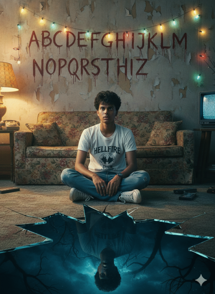 Create a cinematic poster.Show the same person from the reference - sitting con the floor inside a retro 1980s living room - wearing a white and black Hellfire Club t-shirt, blue jeans, white sneakers, the person's expression should be tense and distracted, as senses something unsettling nearby. Behind the person on the wall, include the iconic alphabet painted in a messy, horror-style handwriting, with colorful Christmas lights hanging above each letter. The lights should glow faintly, adding a chilling ambience to the room. In the foreground, at the bottom of the image, show a cracked reflective surface leading into a dark supernatural world - like a portal to the Upside Down - where a distorted shadowy reflection of thesame person appears, surrounded by fog, branches, and eerie blue-black tones.The environment must feel nostalgic and haunted: an old sofa, vintage decor, muted colors, soft film grain, dust particles, and low warm lighting in the living room contrasted with cold, ominous tones in the reflect