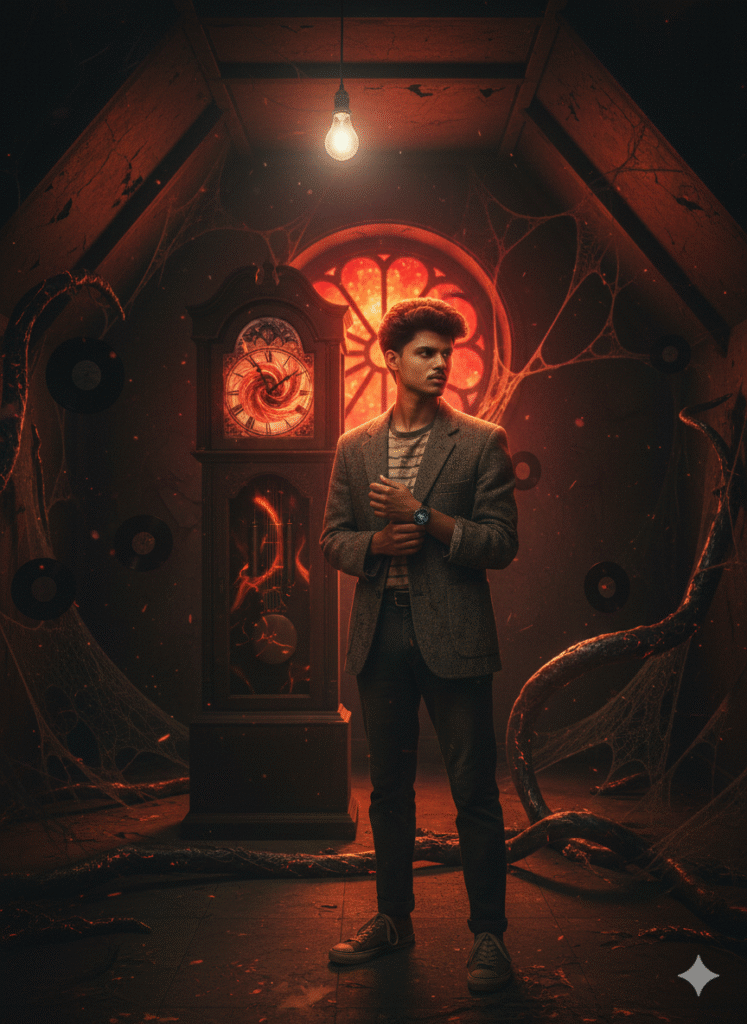 Produce a dark, atmospheric scene inside the Creel House from Season 4. The person in the reference photo is now standing in the attic with Vecna’s grandfather clock behind them. Preserve every single facial detail, hair, eye direction, and expression from the reference image with zero deviation. Light them dramatically with a single hanging bulb swinging slowly, casting deep shadows and warm orange highlights exactly like the show’s cinematography. Dress them in 1950s-meets-1980s clothing with subtle blood stains and dust. In the background, show the stained-glass rose window glowing red, spiderwebs, floating vinyl records, and Vecna’s tentacles creeping along the walls. Add the signature red-black Upside Down particles in the air. Use Arri Alexa-style digital look mixed with 1980s lens diffusion, strong chiaroscuro lighting, and the eerie silence vibe of the Creel House scenes.