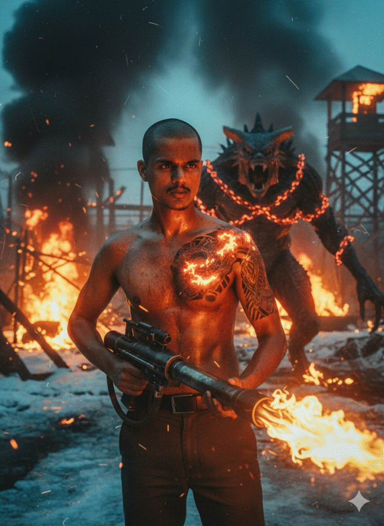 Turn the person in the reference photo into Chief Jim Hopper straight out of the Russian prison in Season 4, preserving 100% of their real facial features, beard length and style from the reference, eye intensity, scars, exact age and brutal expression. Show him shirtless with the massive flamethrower, body covered in sweat, blood, and ash, shaved head, dragon tattoo glowing under fire light. Background: burning Russian gulag, Demogorgon roaring in chains, snow mixed with fire. Lighting: intense orange fire light + cold blue snow reflections. Use gritty 35mm film look, smoke, embers, lens dirt, and maximum “I’m back from the dead” badass energy. Use the face from the uploaded reference image and preserve the same facial features – do not alter the face.