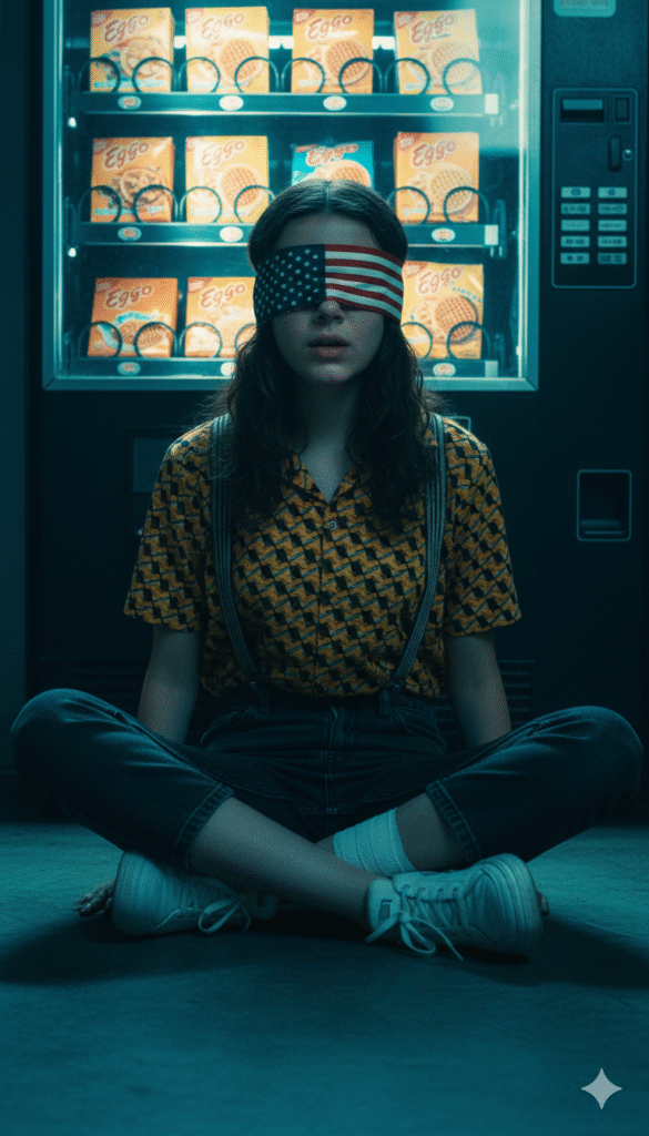 Create a high-quality realistic photo using the face from the reference without any changes.• Character: a young, slender girl with long wavy hair, styled as Eleven from Stranger Things.• Blindfold: a USA-flag blindfold covering her eyes.Clothing: a short-sleeved collared shirt with a dense yellow-and-black geometric pattern, tucked into dark pants or jeans with crossedsuspenders; anay be visible.Footwear: light, chunky sneakers; a white bandage on her ankle.• Pose: sitting on the floor with her legs crossed or tucked under her, looking straight ahead with her mouth slightly open.Background: a vending machine or counter behind her with neat rows of waffle packages resembling Eggo.• Atmosphere: dark, cold, cinematic, with dominant blue and turquoise tones.• Style: dramatic, hyperrealistic, film-like, with an '80s retrowave mood; backlighting or vending-machine lighting creates deep
